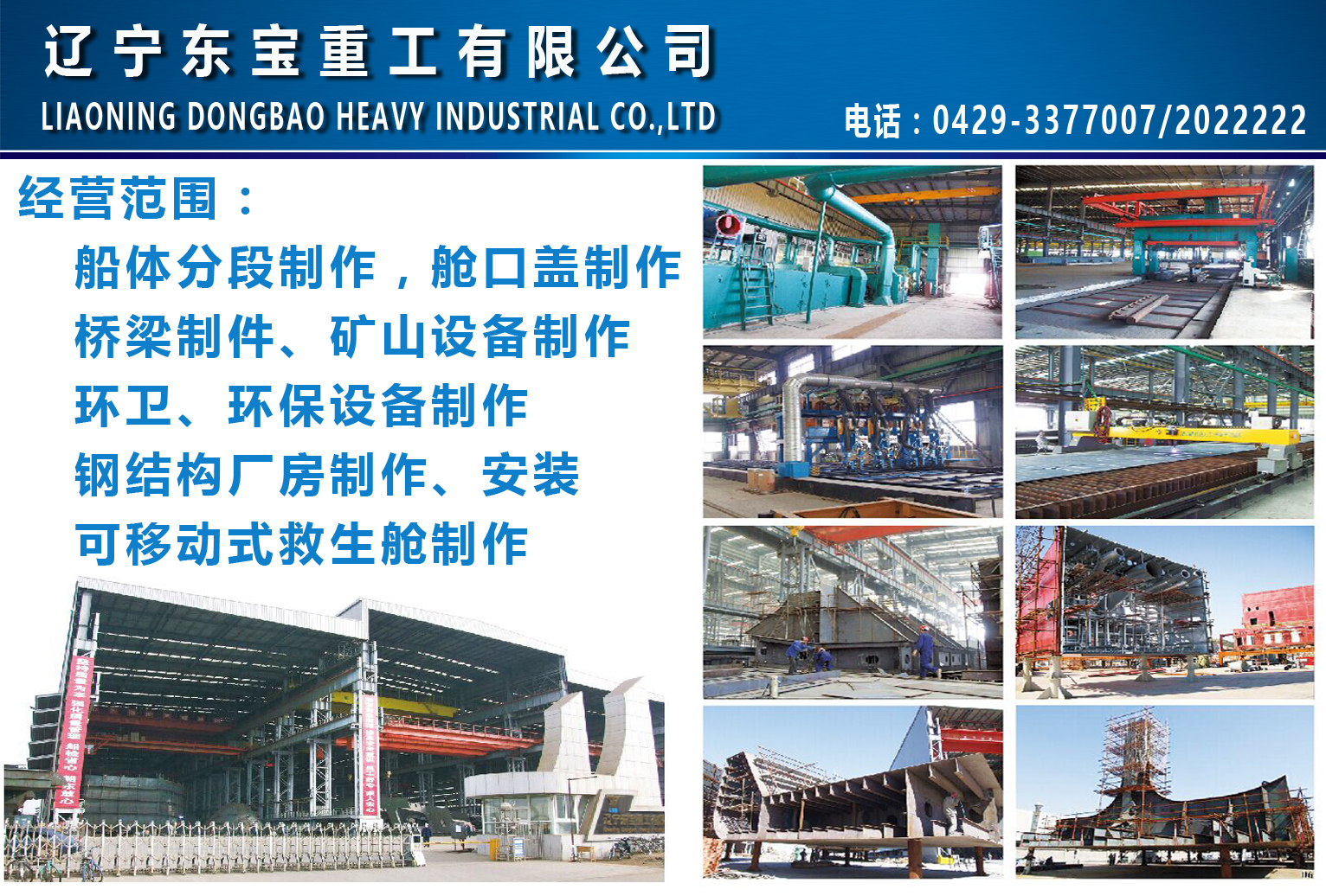 Liaoning Dongbao Heavy Industry Co., Ltd. is located in Huludao Marine Engineering Supporting Park, covering an area of 80,000 square meters and a total construction area of 56,000 square meters. 公司主要經營范圍:船體分段制作,艙口蓋制作, 橋梁制件、鋼結構廠房制作、環衛、環保設備制作,礦山設備制作及可移動式救生艙的制作。在制造安裝方面具有豐富的經驗和雄厚的技術力量,是造船、石油、電力、礦山企業的長期合作伙伴。