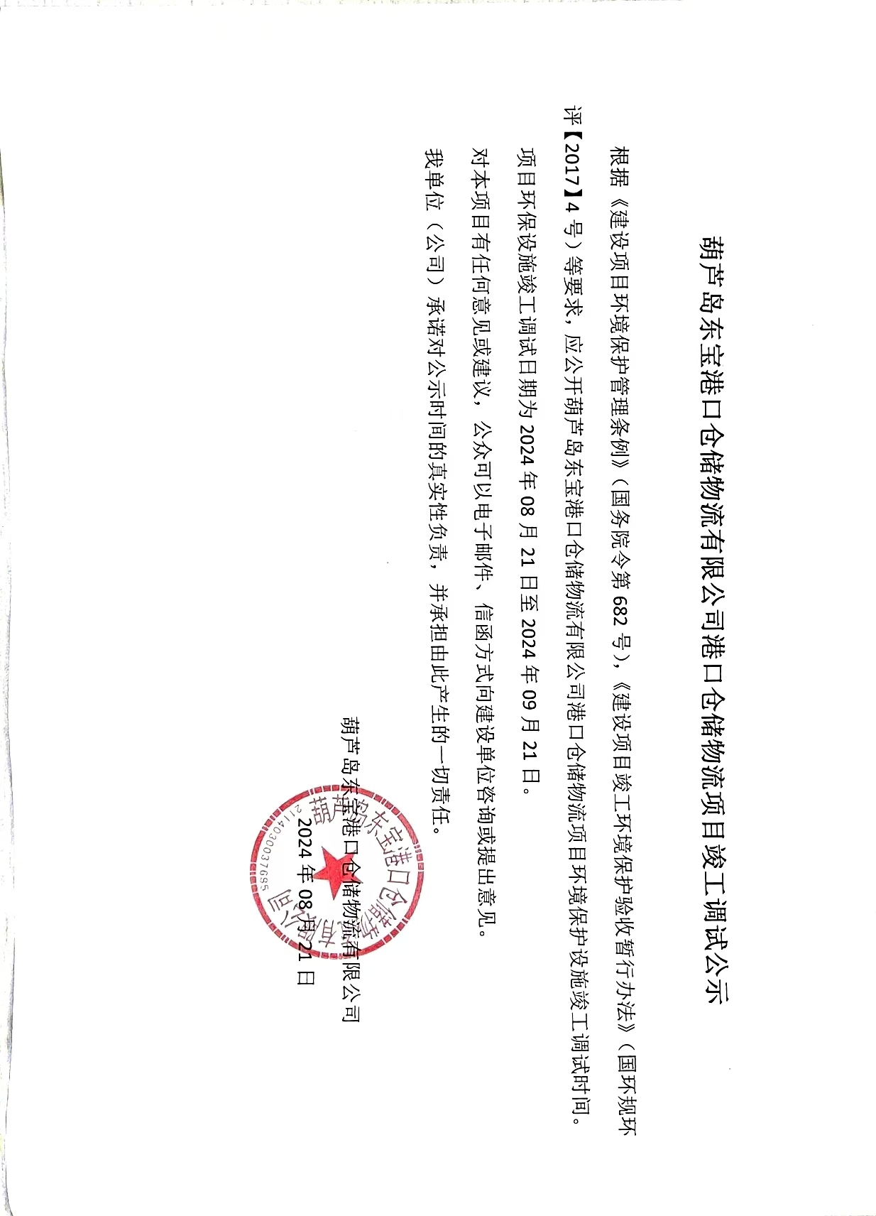 葫蘆島東寶港口倉儲物流有限公司港口倉儲物流項(xiàng)目竣工調(diào)試公示