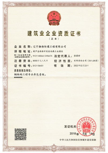 遼寧渤海防腐工程有限公司《鋼結構專業承包壹級》資質證書